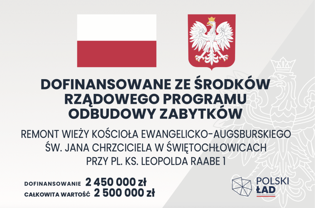 Parafia Ewangelicko-Augsburska w Świętochłowicach zaprasza do składania ofert na wykonanie robót budowlanych związanych z remontem dachu i renowacją elewacji wieży w ramach inwestycji pn. „Remont wieży kościoła Parafii Ewangelicko-Augsburskiej św. Jana Chrzciciela w Świętochłowicach przy pl. ks. Leopolda Raabe 1”, dofinansowanej ze środków Rządowego Programu Odbudowy Zabytków Nr RPOZ/2022/9698/PolskiLad.